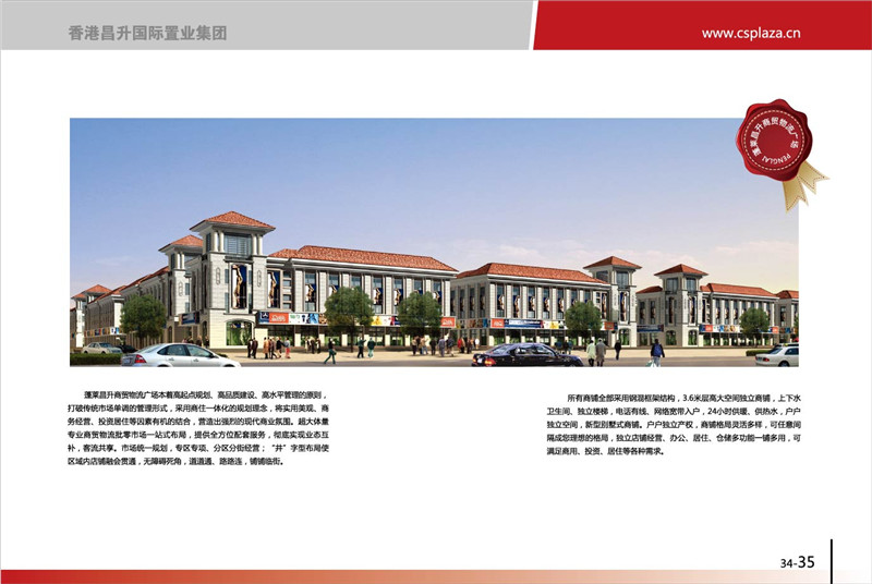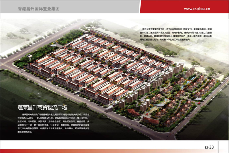 蓬莱昌升商贸物流广场是香港昌升国际集团于2010年投资开发的商贸力作。项目总投资9亿元人民币,一期占地295亩,建筑面积达26万平方米,集五金机电、建筑材料、汽车配件、农资农具、土特杂品经营、商业配套住宅、商务会馆、多功能展示与一体,是一座品种丰富、分工专业、配套完善、经营规范的超大规模现代综合商贸物流园区,也是胶东北地区规模最大、业态最全、配套设施最先进的商贸物流市场。