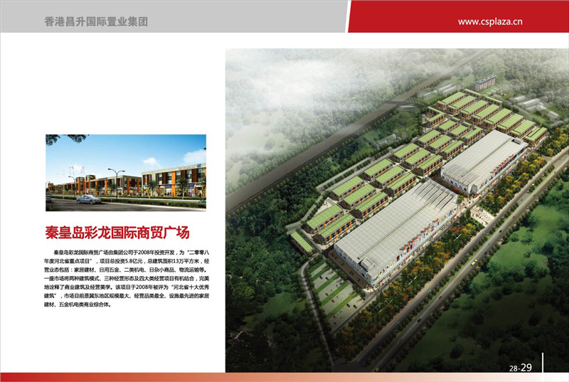 秦皇岛彩龙国际商贸广场由集团公司于2008年投资开发,为“二零零八年度河北省重点项目”,项目总投资5.8亿元,总建筑面积13万平方米,经营业态包括:家居建材、日用五金、二类机电、日杂小商品、物流运输等。一座市场将两种建筑模式、三中经营形态及四大经营项目有机结合,完美的诠释了商业建筑与经营美学。该项目于2008年被评为“河北省十大优秀建筑”,市场目前是冀东地区规模最大、经营品类最全、设施最先进的家具建材、五金机电类商业综合体。