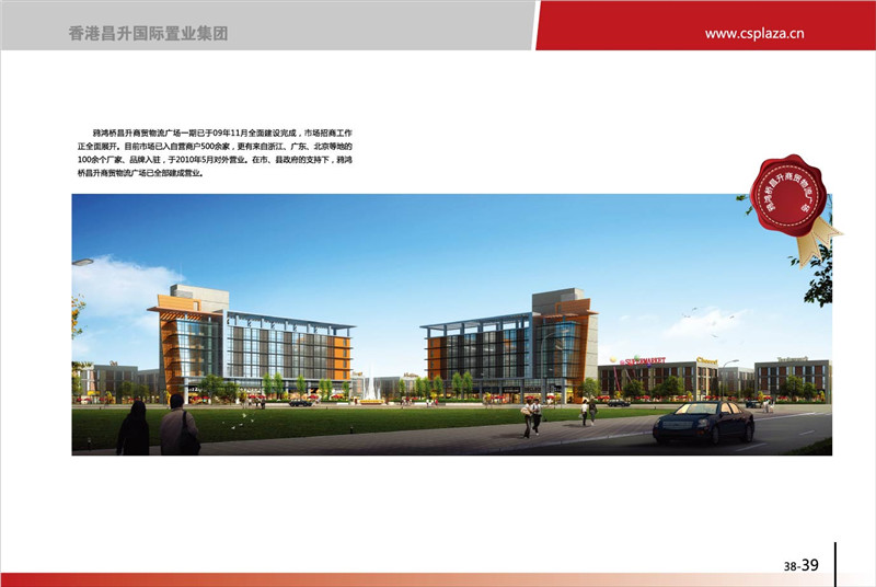 鸦鸿桥昌升商贸城物流广场一期已于2009年11月全面建设完成,目前市场已入自营商户700余家,更有来自浙江、广东、北京等地的千余个品牌入驻,于2010年5月对外营业。在市、县政府的支持下,鸦鸿桥昌升商贸物流广场已全部建成营业。
