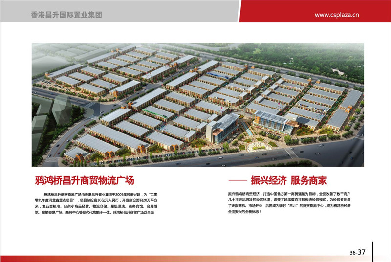 鸦鸿桥昌升商贸物流广场由香港昌升国际集团于2009年投资兴建,为“二零零九年度河北重点项目”,项目总投资10亿元人民币,开发建设面积20万平方米,集五金机电、日杂小商品经营、物流仓储、星级酒店、商务宾馆、会展博览、展销交易广场、商务中心等现代化功能于一体。鸦鸿桥昌升商贸广场以全面振兴鸦鸿桥商贸经济,打造中国北方第一商贸强镇为目标,全面改善了数千商户几十年脏乱阴冷的经营环境,改变了延续数百年的传统经营模式,为经营者创造了无限商机。市场开业将辐射“三北”的商贸物流中心,成为鸦鸿桥经济全面振兴的全新标致!