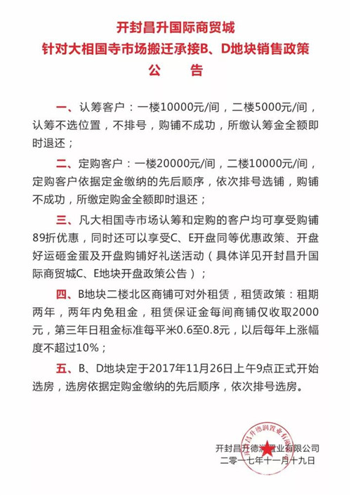 同时,昌升铺位充足,保证大相国寺市场商户都有铺位,还未选铺的商户今天依然可以到营销中心选安置区铺位,我们在昌升等您!