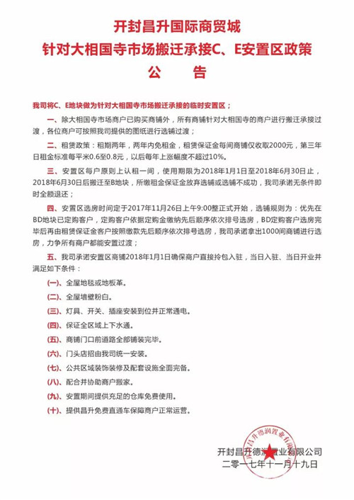 昌升有优势、有信心、有能力全面承接大相国寺市场的搬迁工作,预计元旦商户就可以入驻经营了。昌升将不负市政府和十三大市场商户朋友的众望与寄托,加快承接速度,切身实地的为商户着想,打造开封商业新中心!拥抱昌升,共同迎接开封商业新时代!